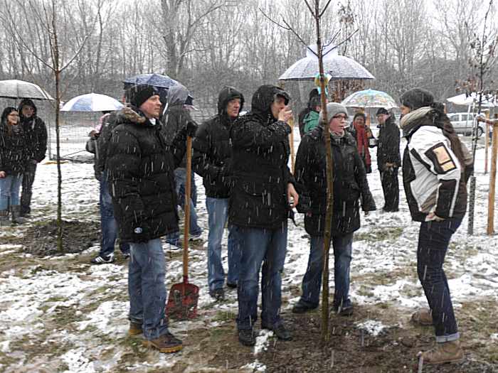 Babywald-Termin im SchneetreibenFrühlingsgefühle hatte kaum jemand beim Pflanztermin im Babywald Rotthausen. Den 20. März eines Jahres hatten sich wohl alle etwas weniger weiß vorgestellt. Wieder konnten die Eltern von in den evangelischen Kliniken Geborenen symbolträchtig einen Baum pflanzen. Dr. Ast, Chefarzt der Gynäkologie, begrüßte die Eltern und Angehörigen, verlas einen kurzen Gedichtstext und gab dann die Aktion frei. Der Bürgerverein Rotthausen sorgte für einen kleinen Unterstand und für heiße Getränke. Der Grill blieb bei dem Wetter aus. |